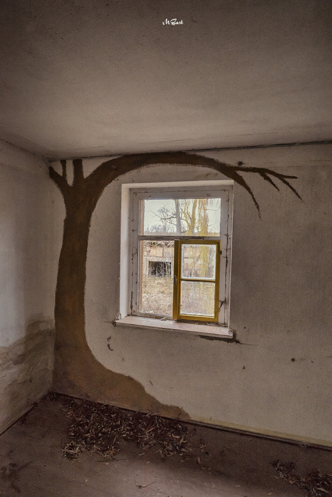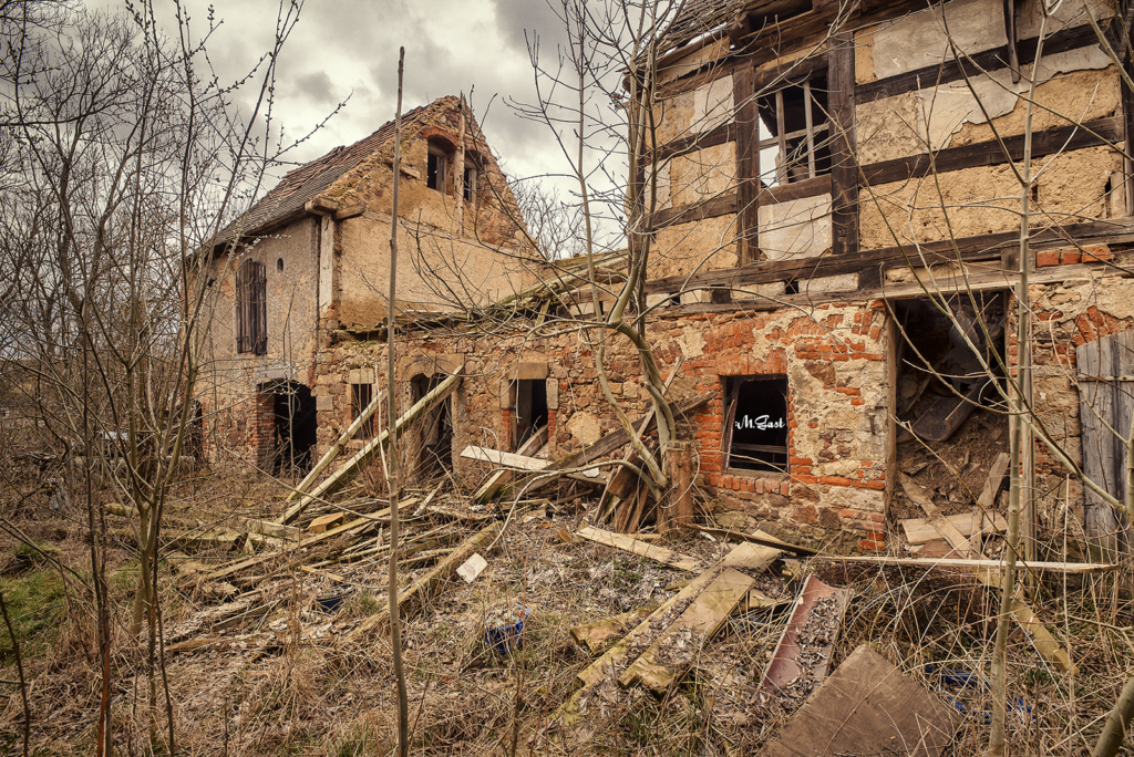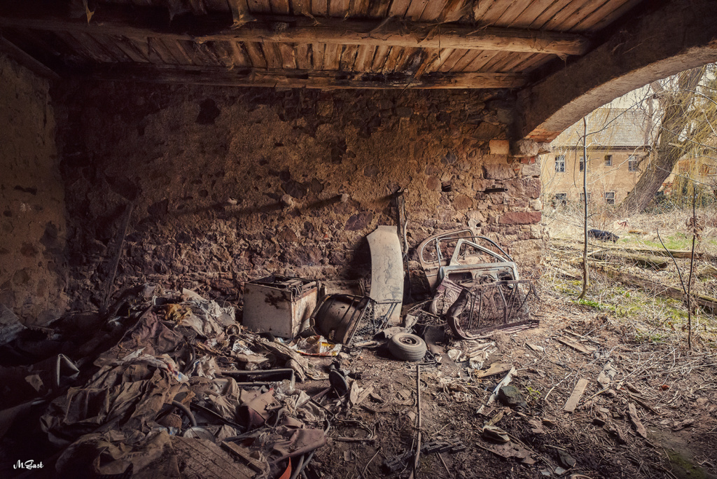 Das Wetter ist wie geschaffen für diesen Ort. Der Wind weht kräftig und kühl durch die langen, biegsamen Äste der großen Trauerweide, die jetzt im Frühjahr einen gelb-grünen Ton annehmen. Durch den kräftigen Wind schlägt im Nebenhaus des Gehöfts immer wieder eine Tür auf und zu. Ein wohl genähter Fuchs sucht das Weite, als er uns Eindringlinge bemerkt. Wieder entdecken wir eine Trabantleiche. Die beeindruckende Trauerweide lässt mir keine Ruhe und meine Kamera schwenkt fast automatisch immer wieder auf sie drauf. Wie alt wird dieser mächtige Baum wohl sein?