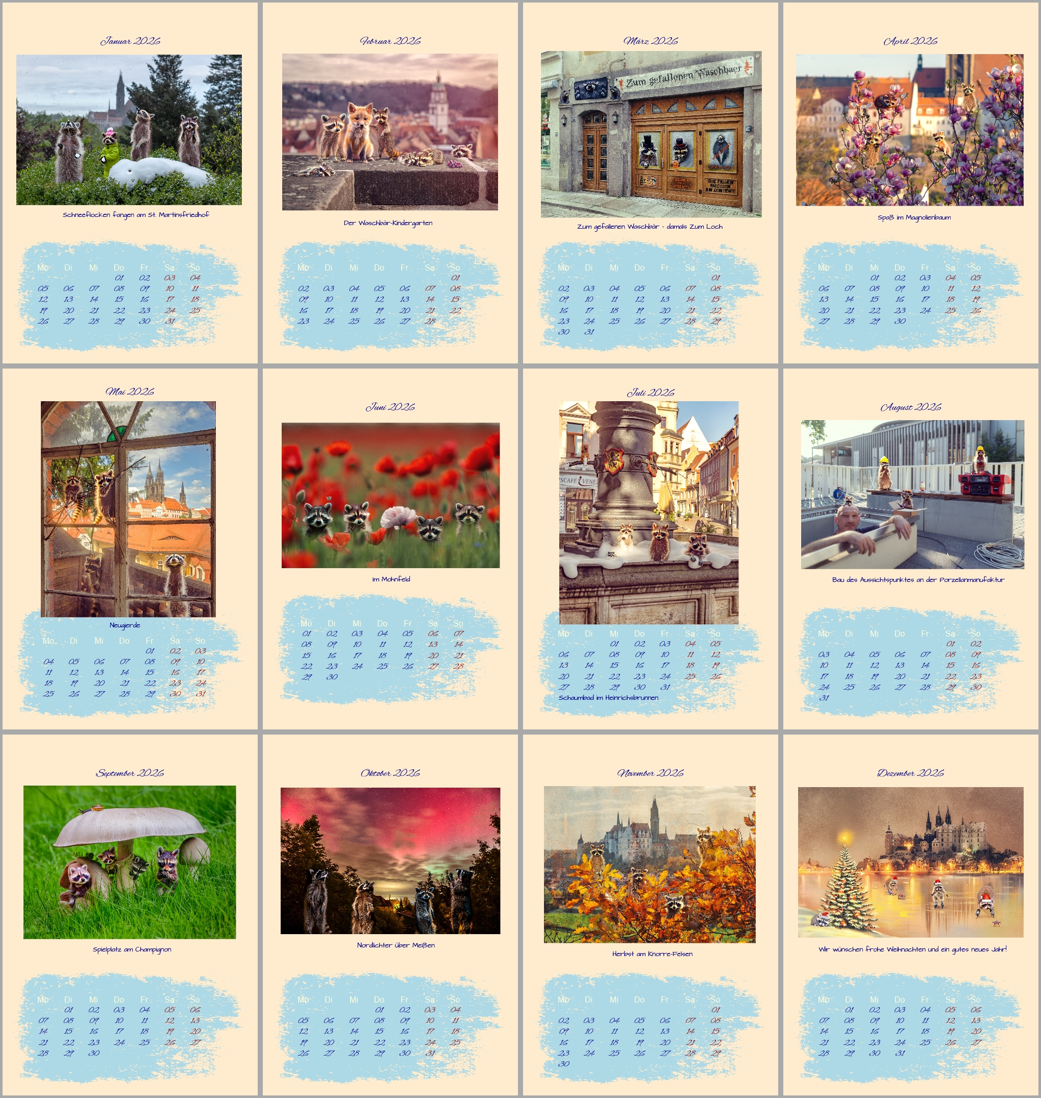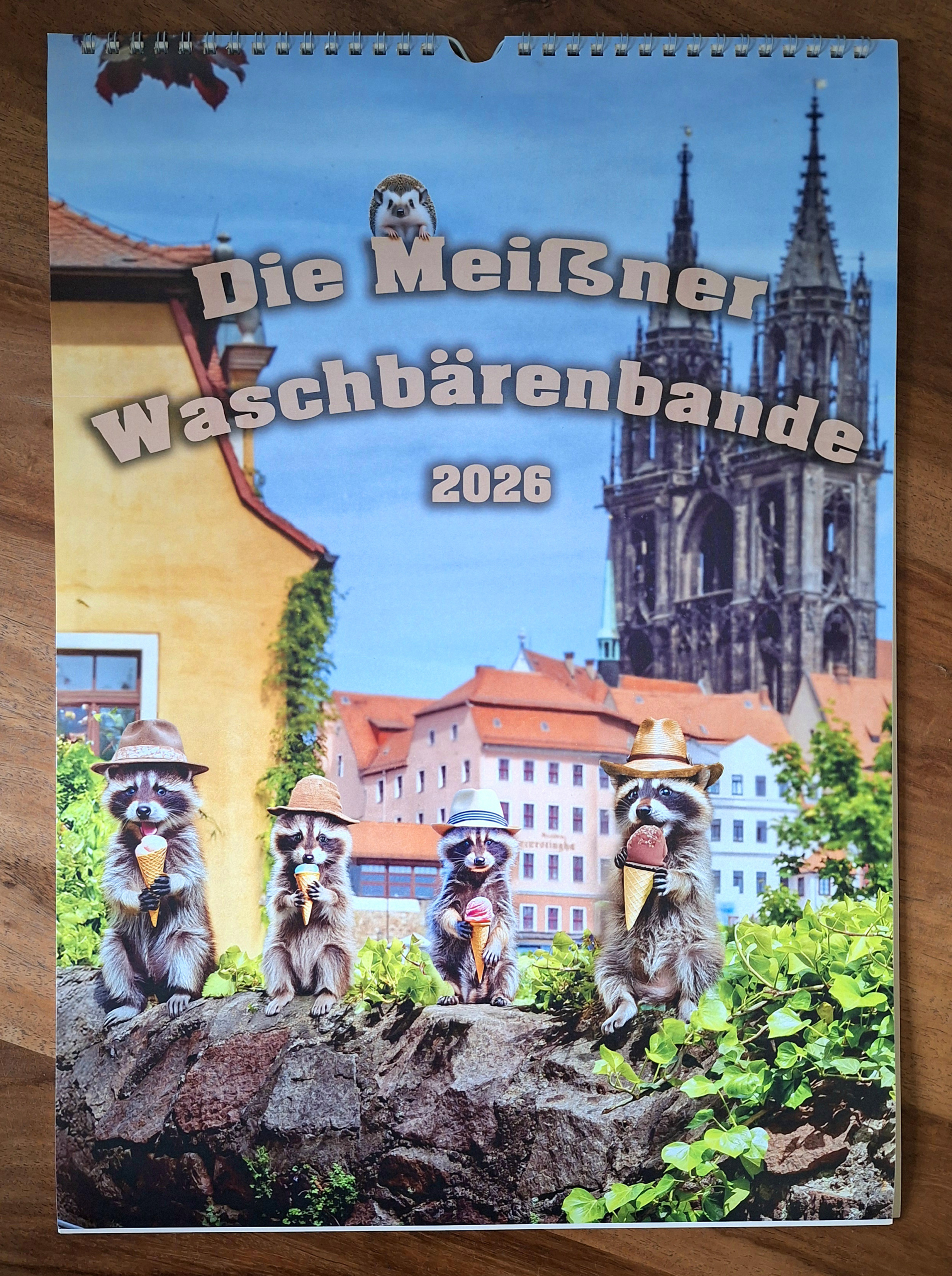 Wandkalender – Die Meißner Waschbärenbande 2026 €14,99 Die lustige Meißner Waschbärenbande im Format A3 als Wandkalender Wandkalender - Die Meißner Waschbärenbande 2026 Menge In den Warenkorb Kategorie: Wandkalender Meißen und Waschbärenbande 2026 Schlagwörter: 2026, kalender, meißen, meißner waschbärenbande, waschbär Ähnliche Produkte Postkarte Meißen: Radtour an der Elbe €1,30 In den Warenkorb Postkarte Afrastufen Meißen mit Mohn €1,30 In den Warenkorb Siesta an der Freiheit in Meißen – Motiv 3 – Leinwand 30×20 €20,00 In den Warenkorb Sammel-Postkarte 3: Carl Spitzweg trifft Meißen – Die Jugendfreunde €1,40 In den Warenkorb